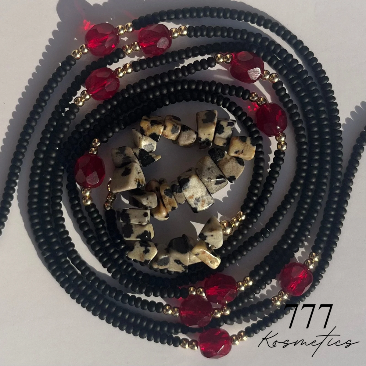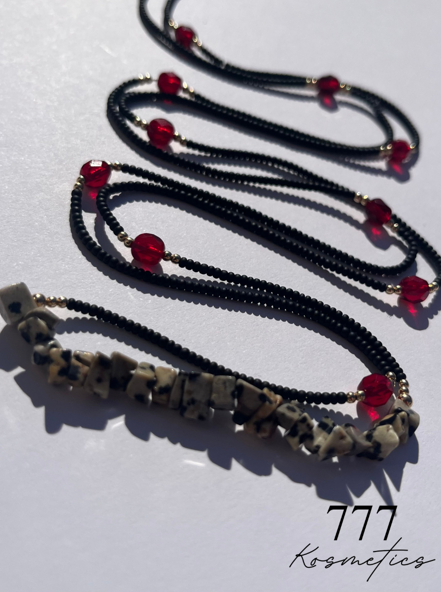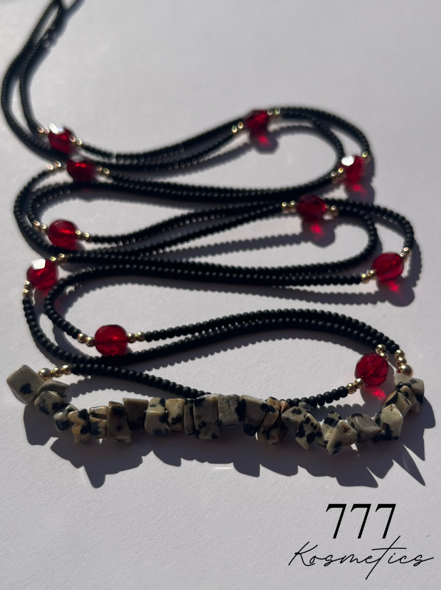 -Features genuine, raw Dalmatian Jasper chips and faceted Ruby Red rounds.