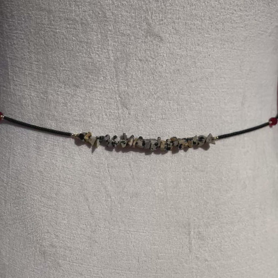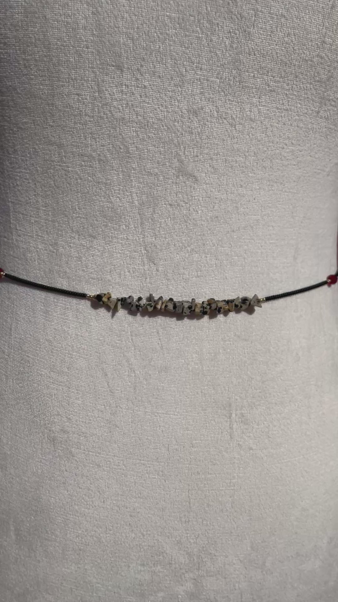 This handcrafted strand features genuine Dalmatian Jasper chips, which are known for their ability to bring happiness, calm anxiety, and banish negative energies. The chips are centered by hints of faceted Ruby Red rounds for passion and vitality. The design is finished with smooth, luminous 14k gold filled accents that offer true luxury and will never tarnish. Wear this adornment to anchor your spirit and celebrate your inner strength.