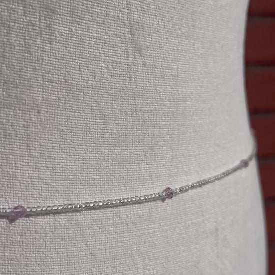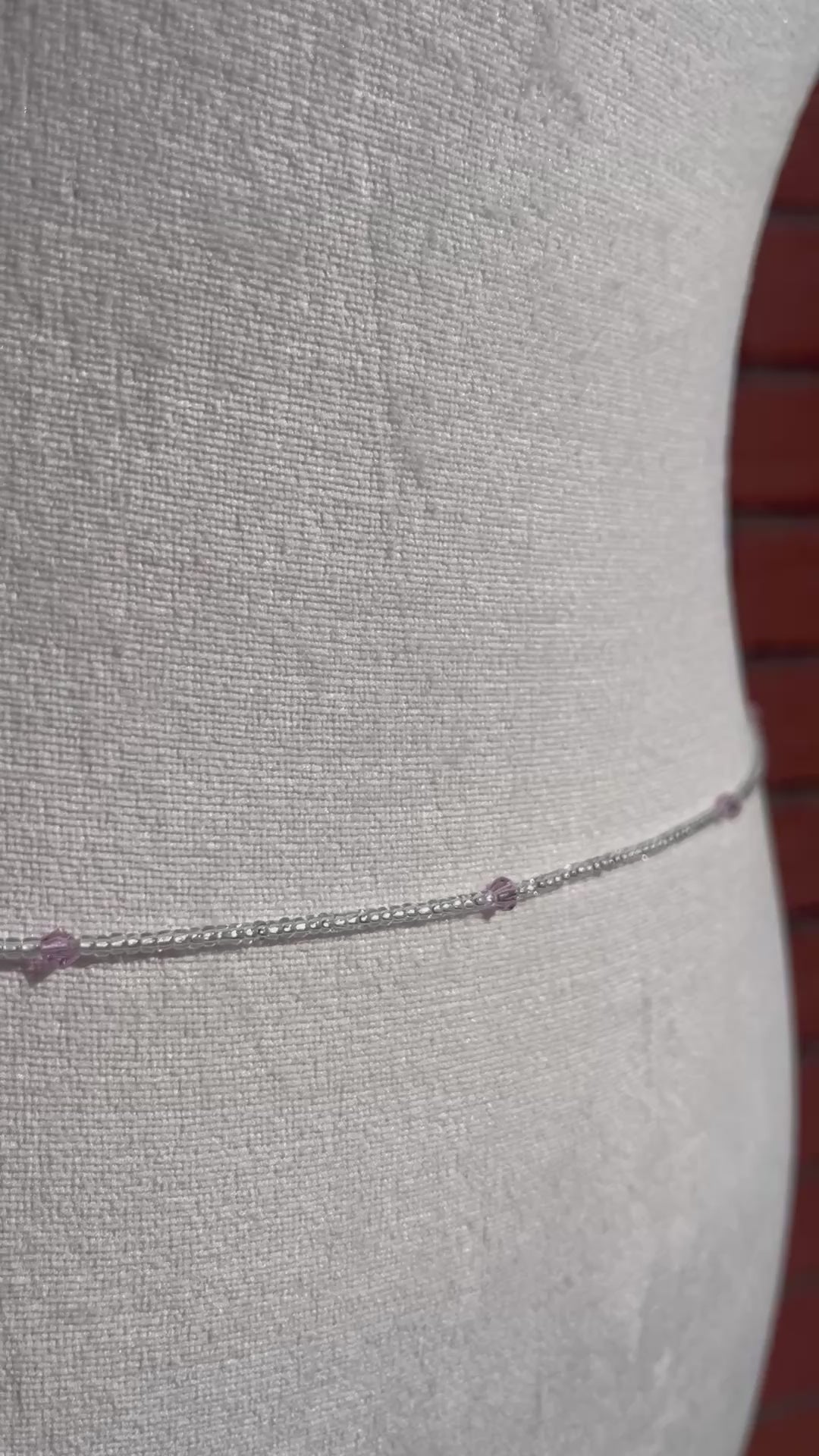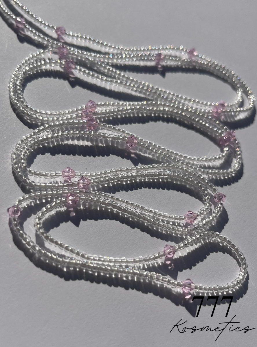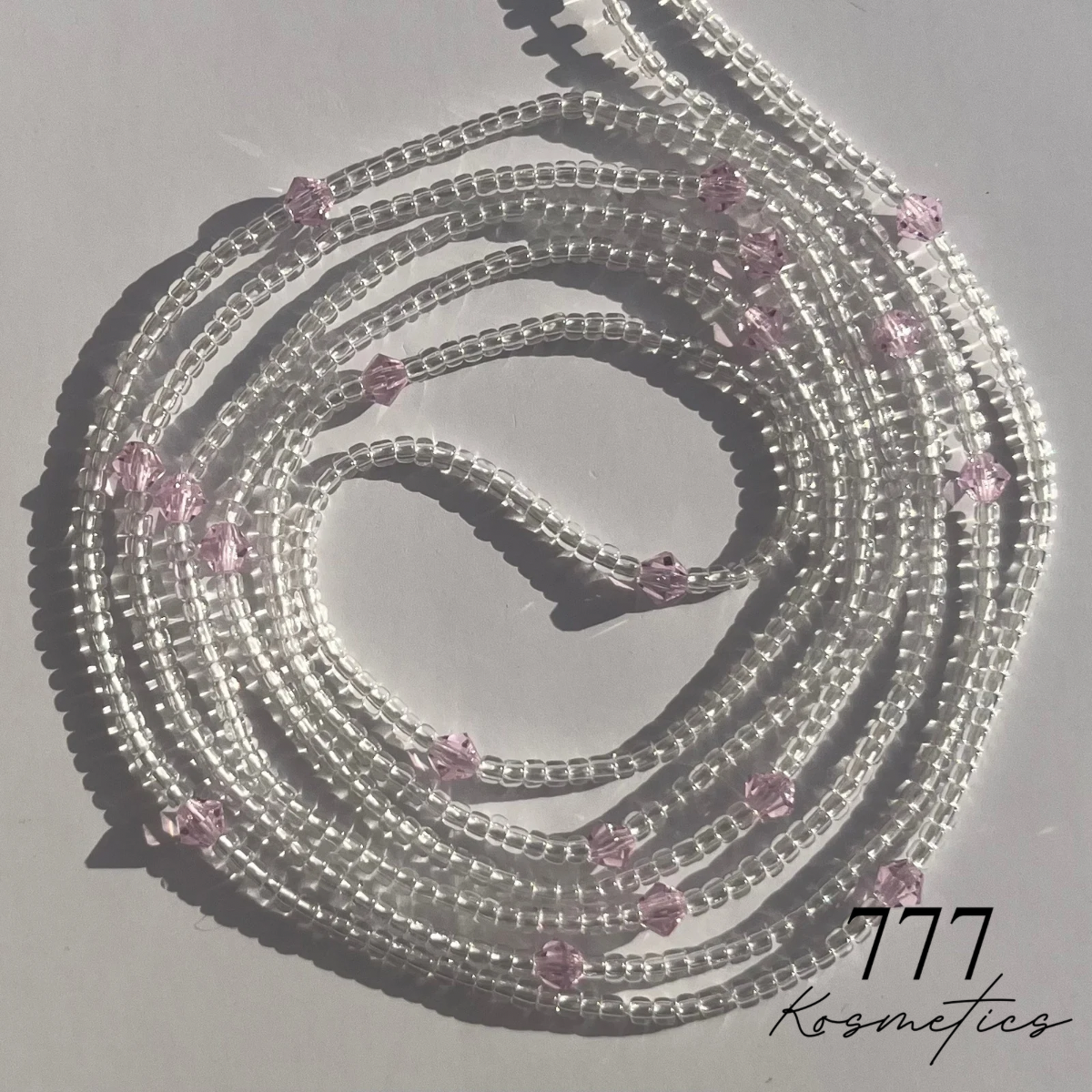 These clear tie-on waist beads are handcrafted to embody self-love, emotional purity, and gentle strength. Soft pink accents weave through the strand intentionally chosen to open the heart, nurture compassion, and encourage acceptance of your divine feminine power. It is a subtle yet constant adornment for those rooted in peace and self-worth.