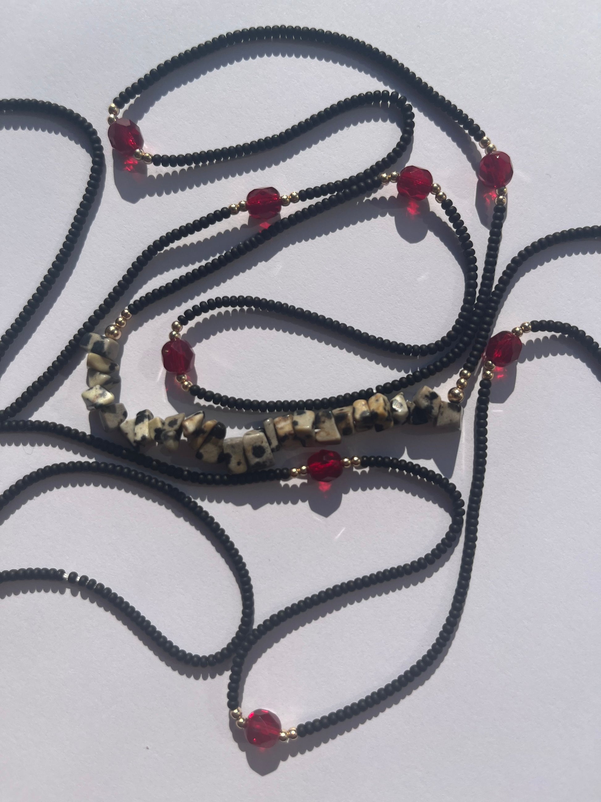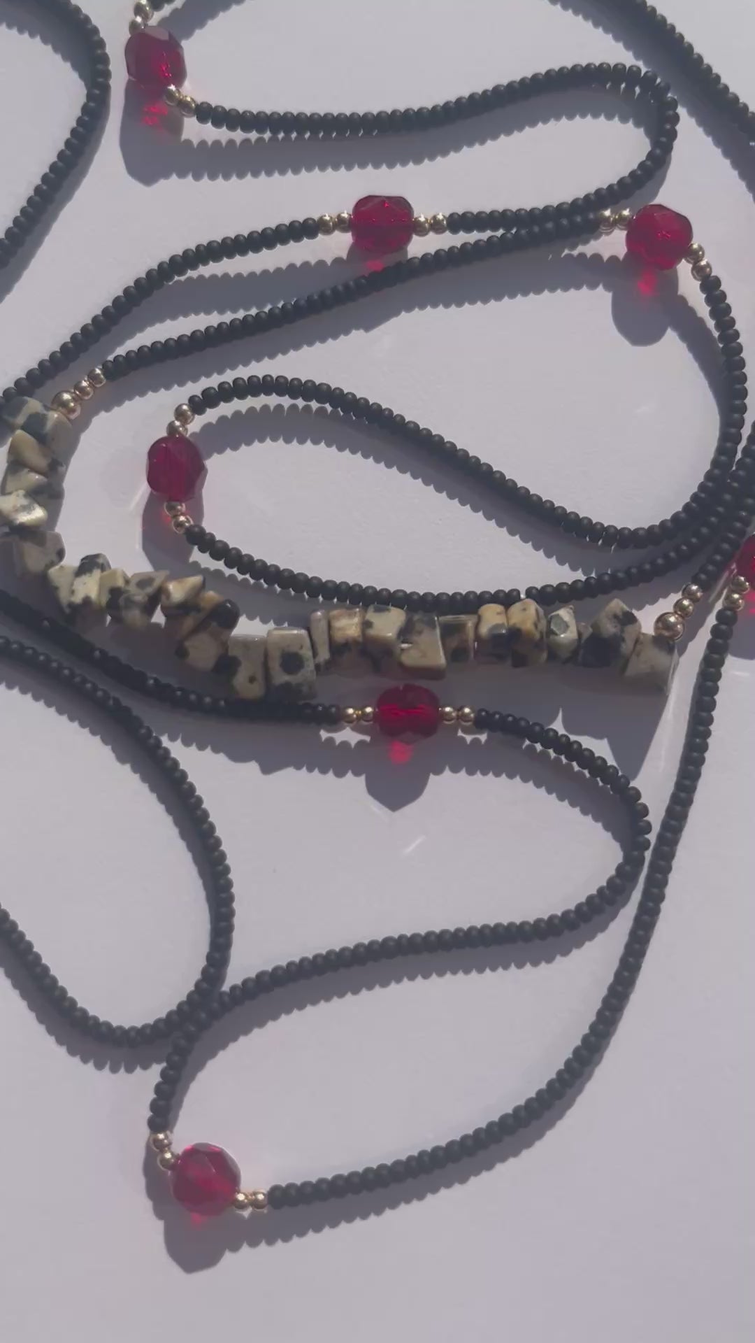 -Features genuine, raw Dalmatian Jasper chips and faceted Ruby Red rounds.