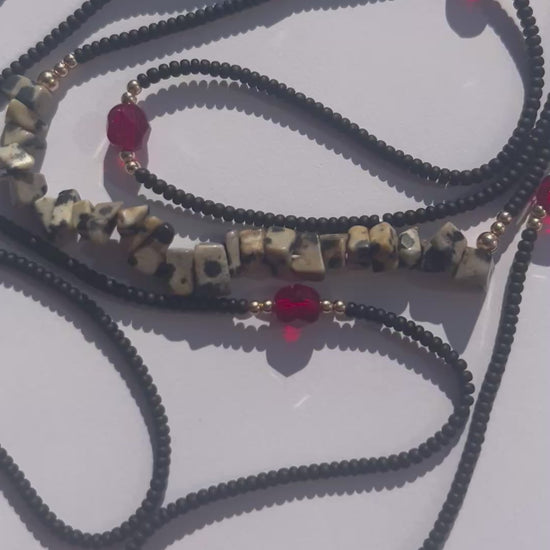 This handcrafted strand features genuine Dalmatian Jasper chips, which are known for their ability to bring happiness, calm anxiety, and banish negative energies. The chips are centered by hints of faceted Ruby Red rounds for passion and vitality. The design is finished with smooth, luminous 14k gold filled accents that offer true luxury and will never tarnish. Wear this adornment to anchor your spirit and celebrate your inner strength.