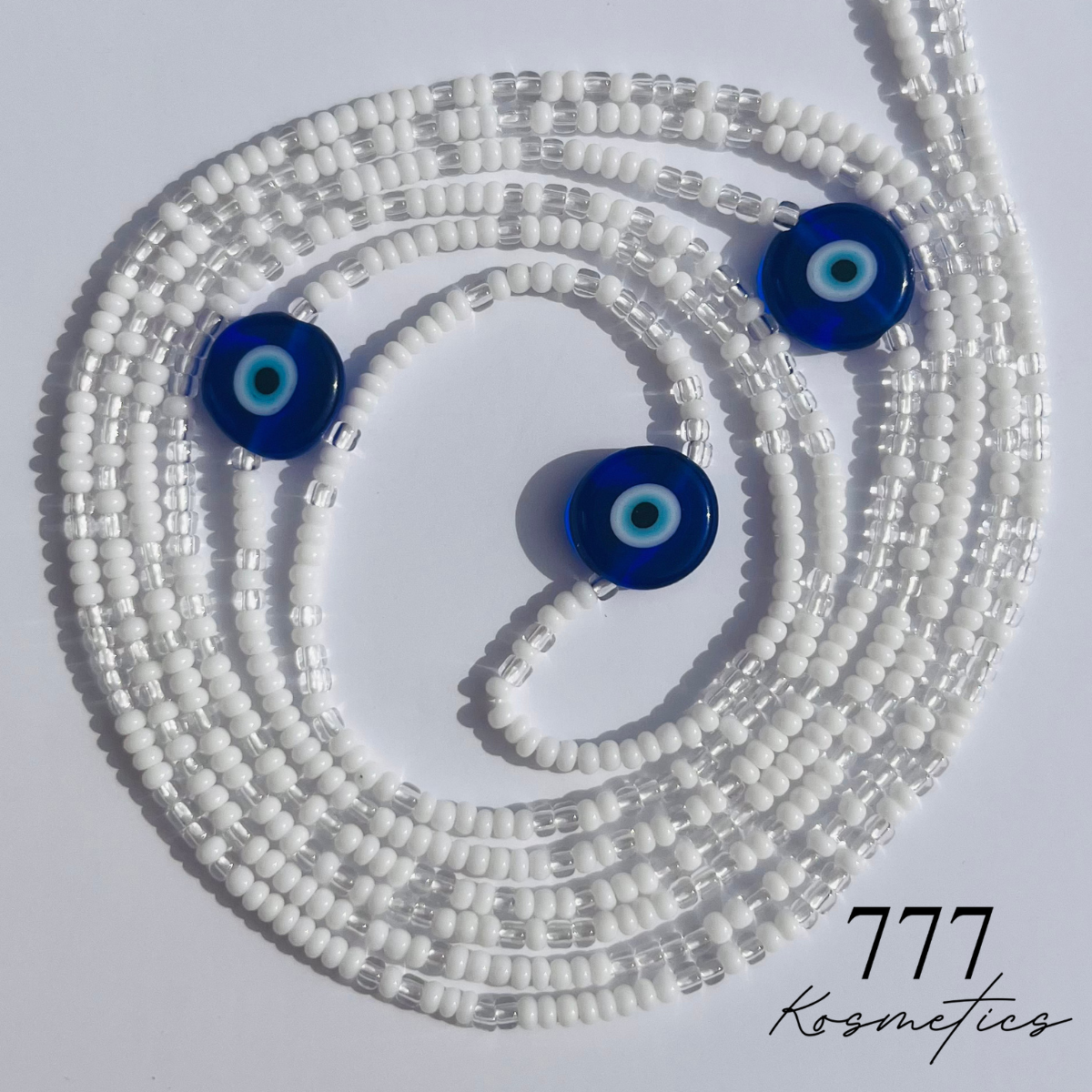 These tie-on waist beads are handcrafted to embody purity, clarity, and spiritual protection. Featuring three traditional blue Nazar (evil eye) beads delicately woven among luminous white and clear beads, this strand is designed to cleanse your energy, protect your spirit, and invite peace into your daily rituals. The Nazar beads are made of handmade glass, and no two are exactly alike—each one may carry slight imperfections that reflect its unique, artisanal character. A soft yet powerful adornment for intention, protection, and radiant alignment.