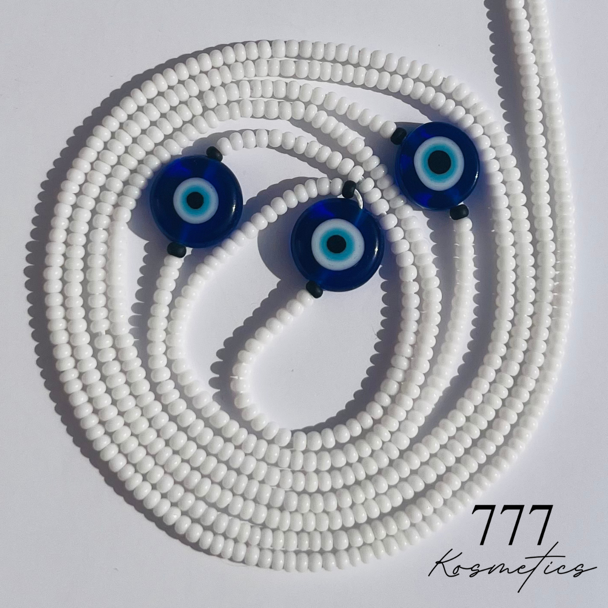 These tie-on waist beads are handcrafted to embody clarity, light, and spiritual protection. Featuring three traditional blue Nazar (evil eye) beads delicately woven among luminous white beads, this strand is designed to shield your aura, dispel negative energy, and amplify your inner radiance. The Nazar beads are made of handmade glass, and no two are exactly alike—each one may carry slight imperfections that reflect its unique, artisanal character. A soft yet powerful adornment for intention, protection, and radiant alignment.